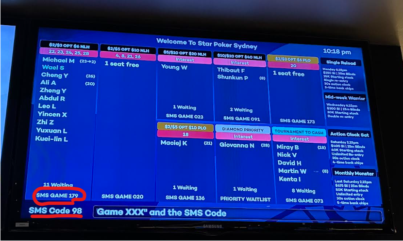 直接カウンターで入れる場合、ポーカールームがオープンする10時以降からになりますが、SMSの場合は、9時からウェイティングに入れることができます。